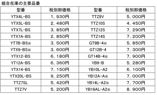 さて、組合で販売しております台湾ユアサバッテリーにつきまして、昨今の原材料の高騰と輸入コストの増大の影響により、価格改定を行うと仕入れ元より連絡がありました。これに伴い当組合でも不本意ながら、下記の内容で価格改定を行うこととなりました。