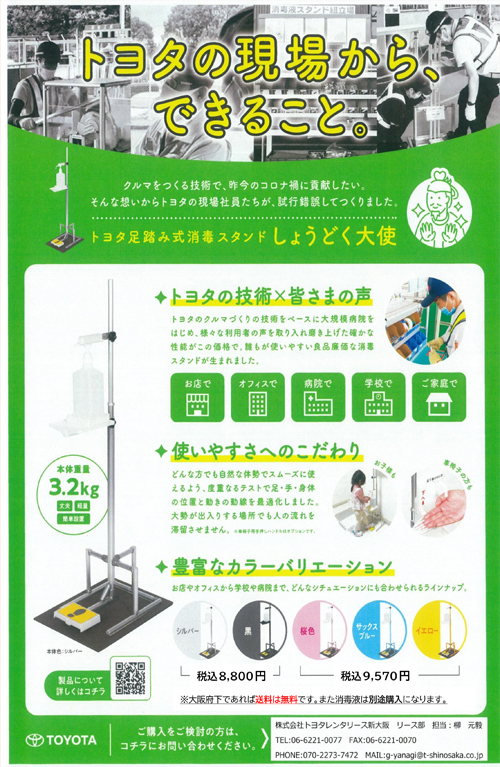 トヨタではクルマづくりの技術をベースに足踏み式消毒スタンドを製造いたしました。ご購入を希望される方は事務局までご連絡願います。