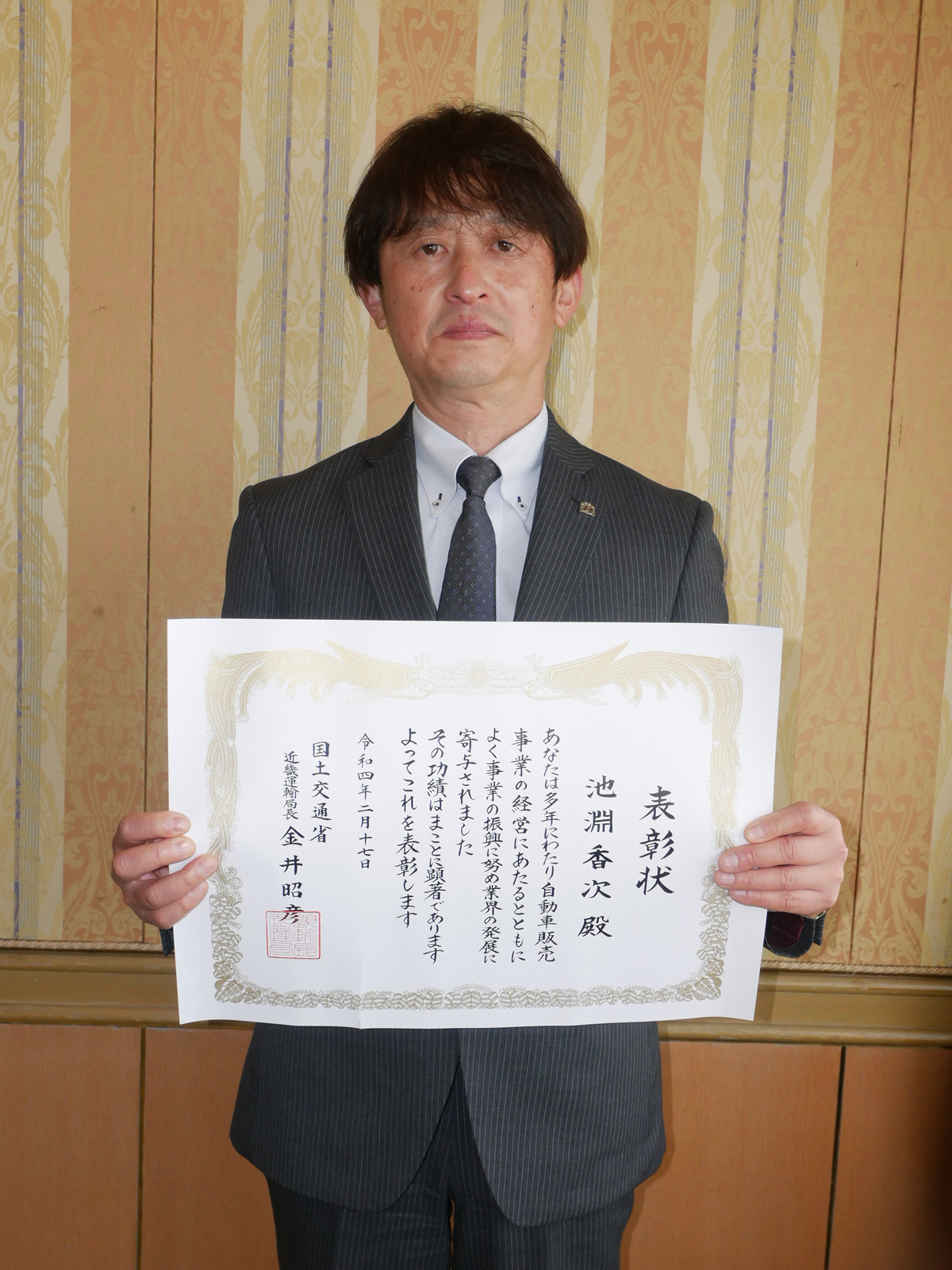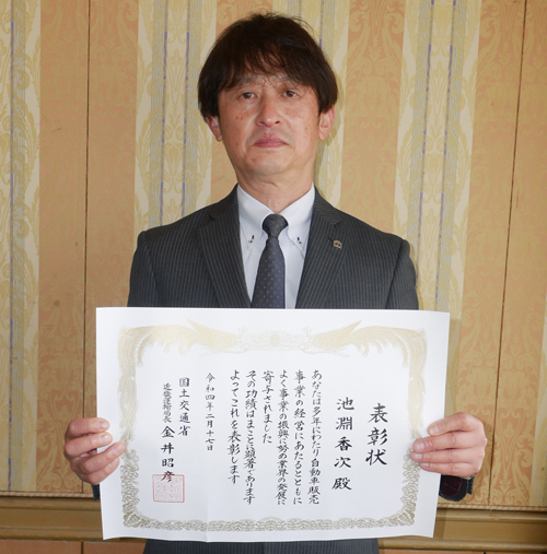 2月17日(木)に「令和3年度近畿運輸局自動車関係功労者表彰」が発表されました。本年は「コロナウイルスまん延防止措置」期間中のため表彰式は中止となりました。今回は63名の方々がそれぞれの分野における功績が認められ表彰を受けました。そのうち事業功労として7名が受賞され二輪関係者としては、大阪オートバイ事業協同組合 理事長の池淵 香次 氏((有)池)が受賞されました。