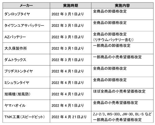 取り扱い各社 価格改定のご案内