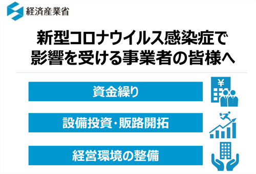 経済産業省の中小企業等への経済対策について掲載いたしておりますのでご参照ください。現在の企業に対する国の主な対策は次の4項目になります。