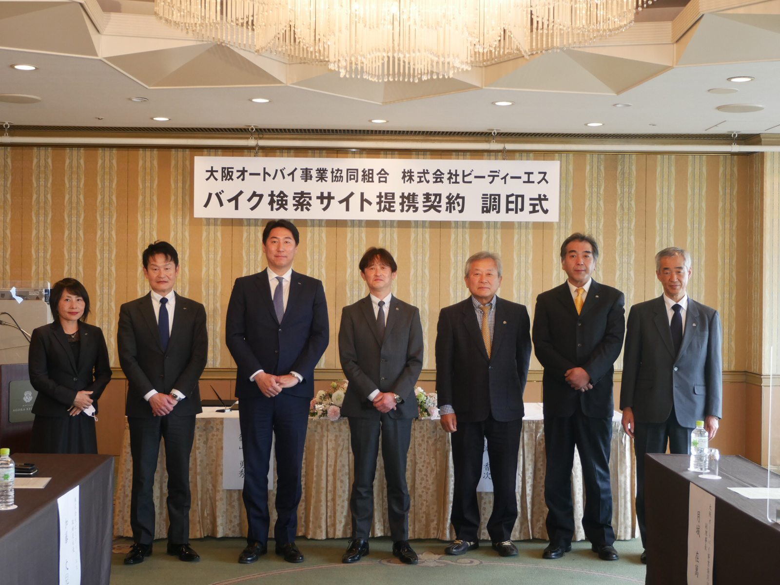 2月22日(火)に大阪オートバイ事業協同組合と(株)ビーディーエスとのバイク検索サイトにおける提携契約調印式が、堺市のホテルアゴーラリージェンシー堺で行われました。組合から池淵理事長、月城副理事長(事業収益委員会総括)、住友事業収益委員長、福井専務理事が出席し(株)ビーディーエスからは徳山代表取締役CEO、加藤取締役社長、小川係長が出席しました。