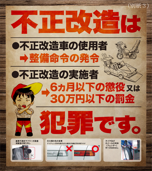 国土交通省は6月を「不正改造車を排除する運動」強化月間として全国で街頭検査を実施するなど、関係省庁、自動車関係団体等と連携し、不正改造車のより一層の排除に向けた取組みを集中的に実施します。全国オートバイ協同組合連合会(AJ)は不正改造防止推進協議会の構成団体として推進しています。